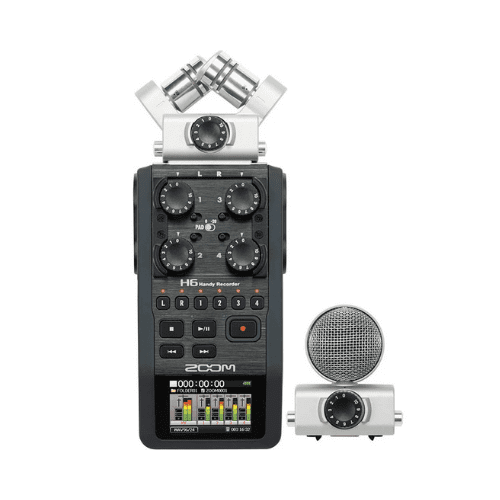 The ZOOM H6 Recorder is a compact and powerful audio solution widely used in film, interview, and podcast production. It offers clean preamps, flexible inputs, and modular microphone capsules. These features make it one of the most popular options in professional sound equipment rental.